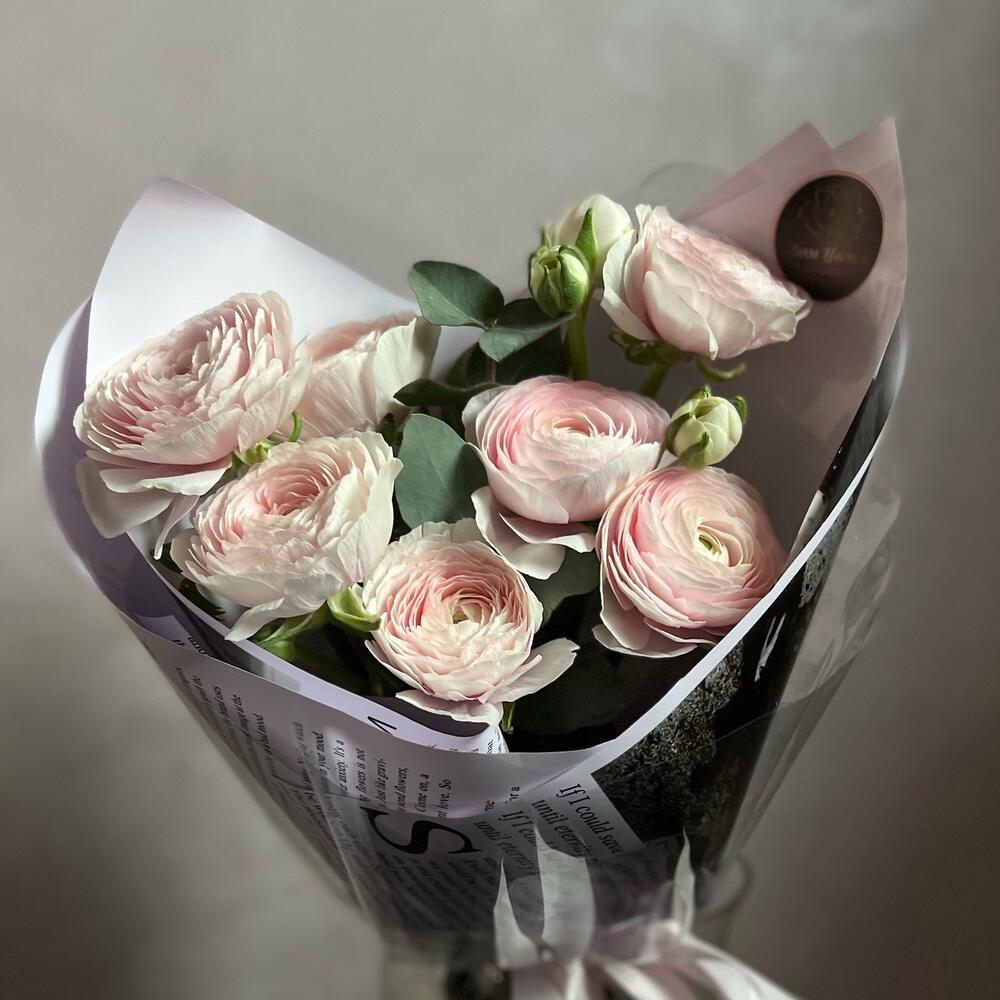 Ранункулюс – 7 шт.Эвкалипт – 3 шт.декоративная упаковка – 1 шт.Атласная лента – 1 шт.