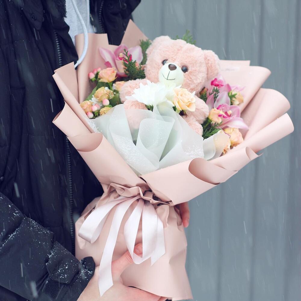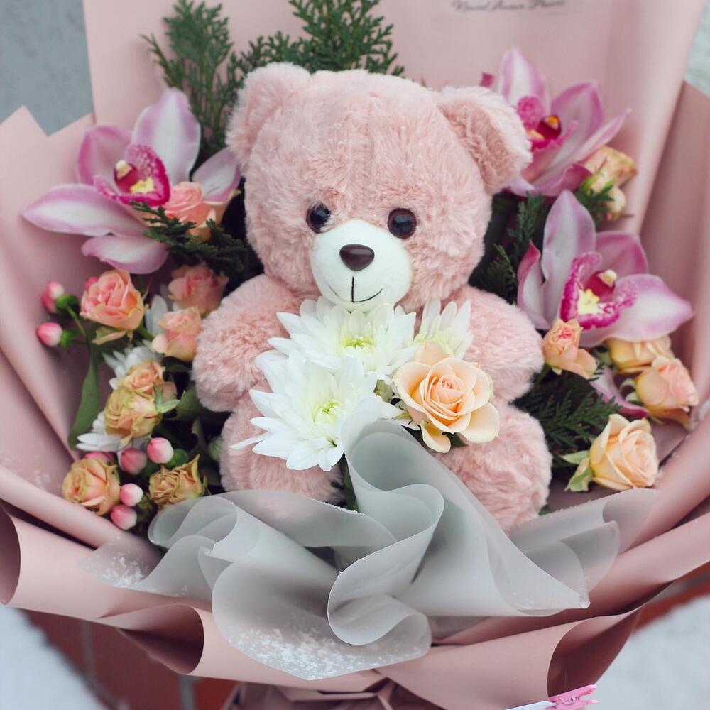 троянда спрей – 5 шт. фісташка – 3 шт. хіперикум – 3 шт. флористичне оформлення – 1 шт. рідина для букета у вазу – 1 шт. ведмежа іграшка – 1 шт. цимбідіум орхідея – 3 шт.
