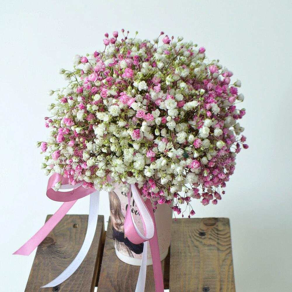 “Сиреневый туман” – композиция из гипсофилы в шляпной коробке