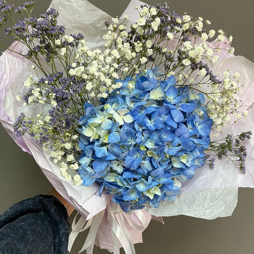 Букет комплимент с гортензией, гипсофиллой, лимониум