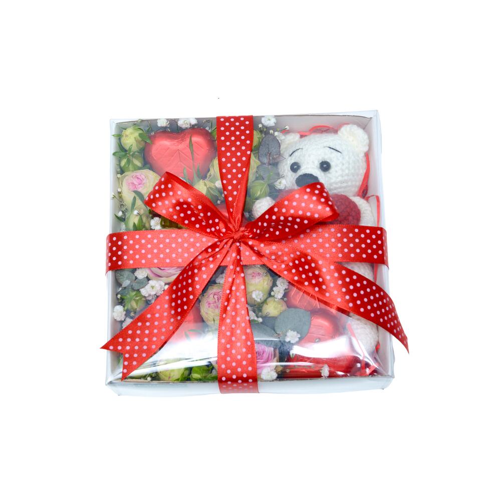 игрушка ручная – 1 шт. пионорозы – 4 шт. Гипсофила – 3 шт. Конфеты – 5 шт. Коробка – 1 шт.