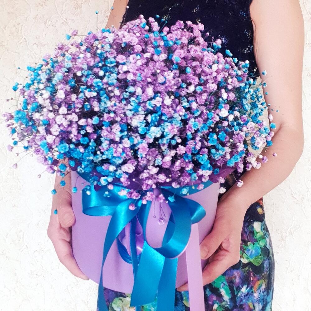 “Сиреневый туман” – композиция из гипсофилы в шляпной коробке