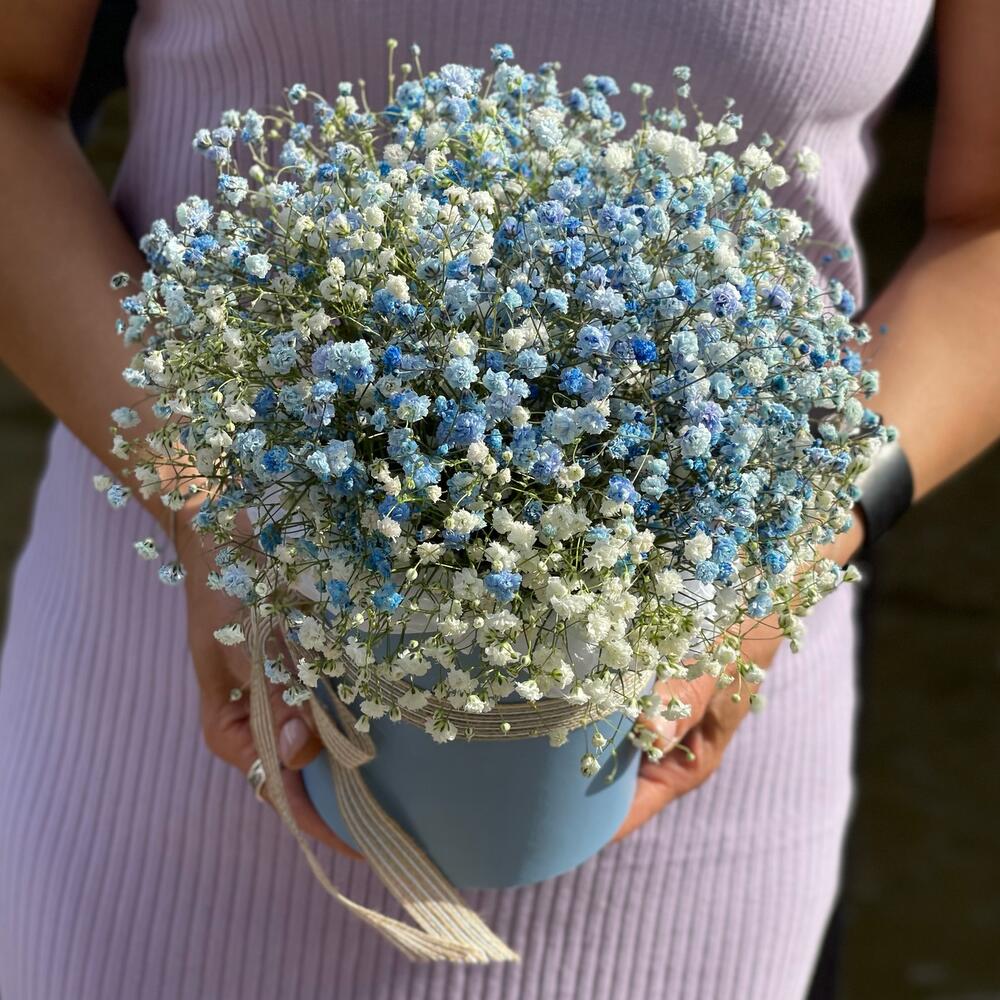 Тишью – 1 шт.Лента атласная – 1 шт.Оазис флористический – 1 шт.Коробка шляпная – 1 шт.Гипсофила – 6 шт.