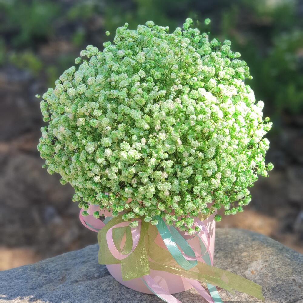 “Сиреневый туман” – композиция из гипсофилы в шляпной коробке