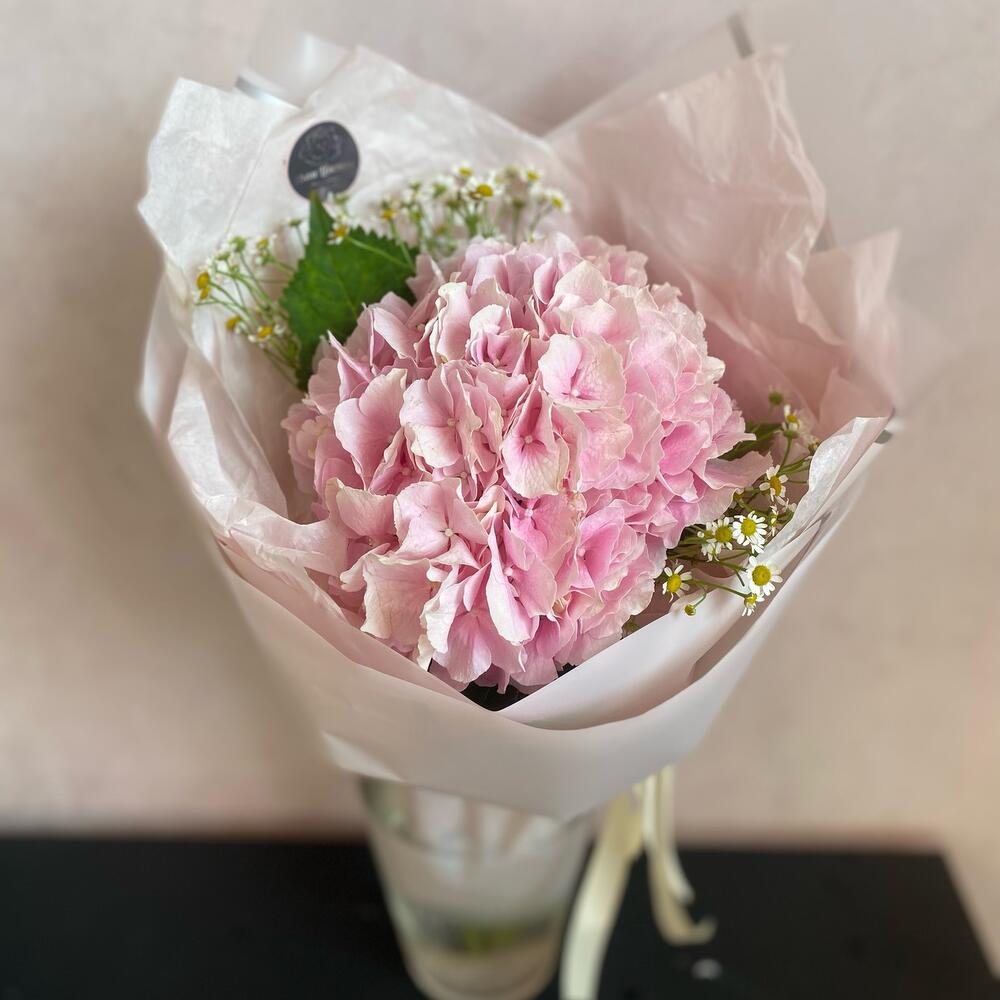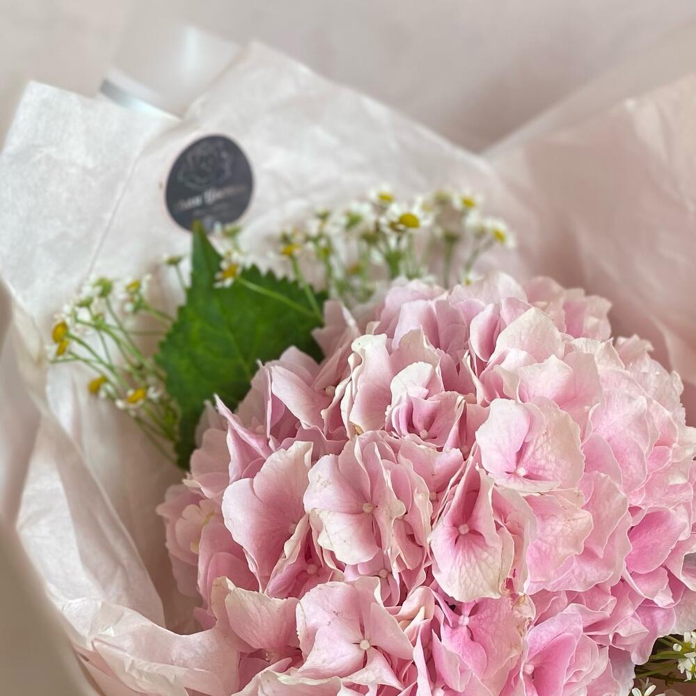 Гортензия – 1 шт.Танацетум – 4 шт.декоративная упаковка – 1 шт.Атласная лента – 1 шт.