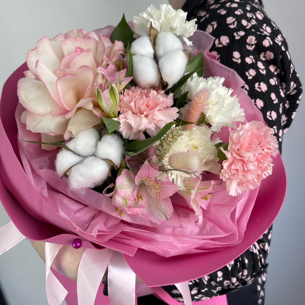 Альстромерия – 1 шт.Рускус – 5 шт.Хлопок – 1 шт.Лента атласная – 2 шт.Диантус – 4 шт.Пшеница – 1 шт.Упаковка дизайнерская – 3 шт.Французская роза – 1 шт.Лагурус – 1 шт.