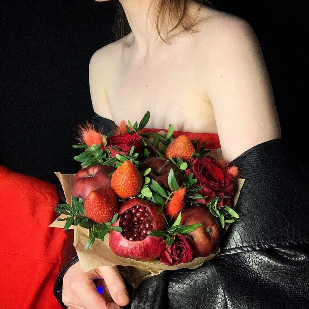 яблоки – 5 шт.гранат красный – 1 шт.Клубника – 3 шт.розы – 2 шт.розы кустовые – 2 шт.гвоздики – 2 шт.фисташка зелень – 1 шт.Лагурус – 4 шт.