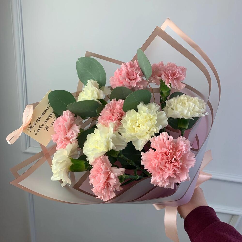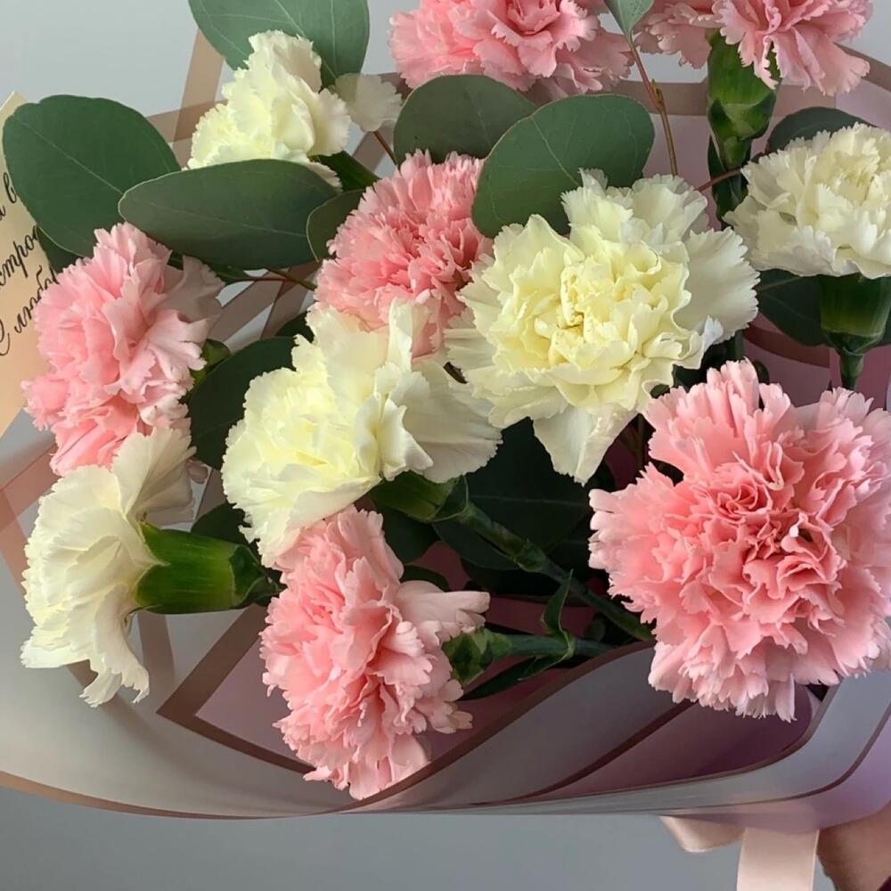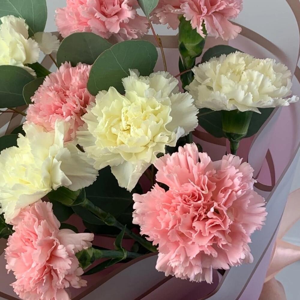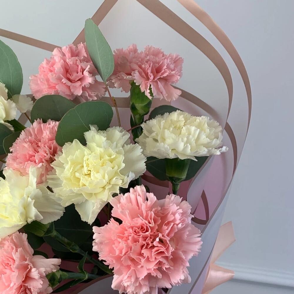 Гвоздика – 11 шт.Эвкалипт – 2 шт.Пленка дизайнерская – 1 шт.Лента атласная – 1 шт.