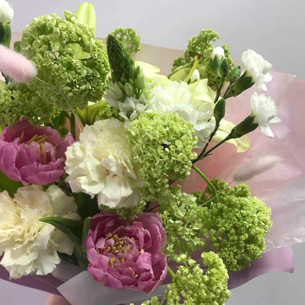 Лилия – 3 шт.Вибурнум – 3 шт.Орнитогалум – 1 шт.Тюльпан пионовидный – 2 шт.Гвоздика кустовая – 2 шт.Лагурус – 2 шт.Упаковка дизайнерская – 1 шт.Лента атласная – 1 шт.Открыточка с вашими пожеланиями – 1 шт.