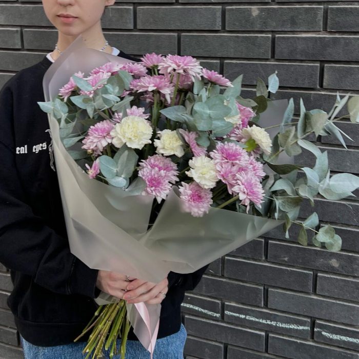11 нежных гвоздик с эвкалиптом