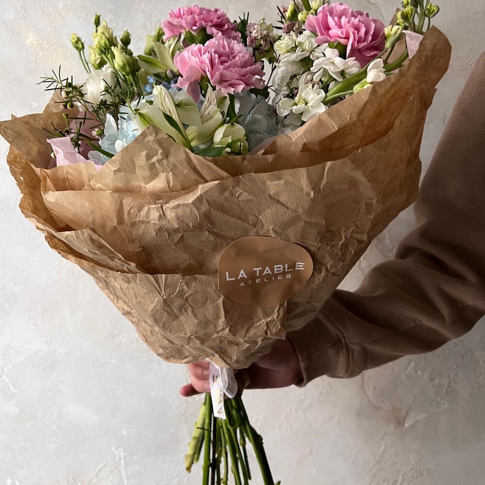 Альстромерия – 2 шт.Ваксфлауэр – 1 шт.Гвоздика розовая – 3 шт.Лизиантус белый – 2 шт.Упаковка дизайнерская – 1 шт.Гортензия голубая – 1 шт.Маттиола белая – 2 шт.оксипеталум голубой – 2 шт.