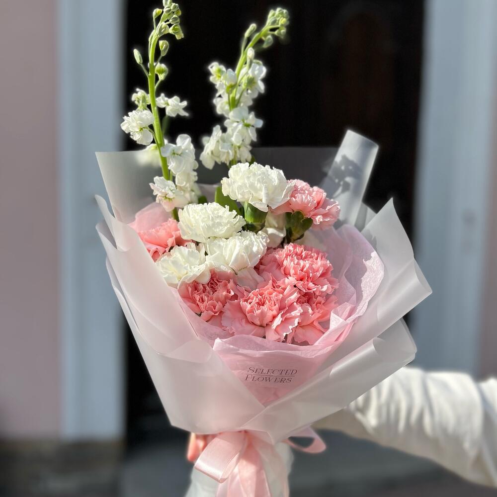 Гвоздика – 13 шт.Маттиола белая – 2 шт.Дизайнерская упаковка – 1 шт.