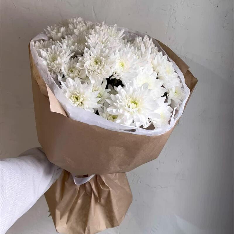 Лента атласная – 2 шт.Хризантема кустовая белая – 7 шт.Упаковка дизайнерская – 3 шт.