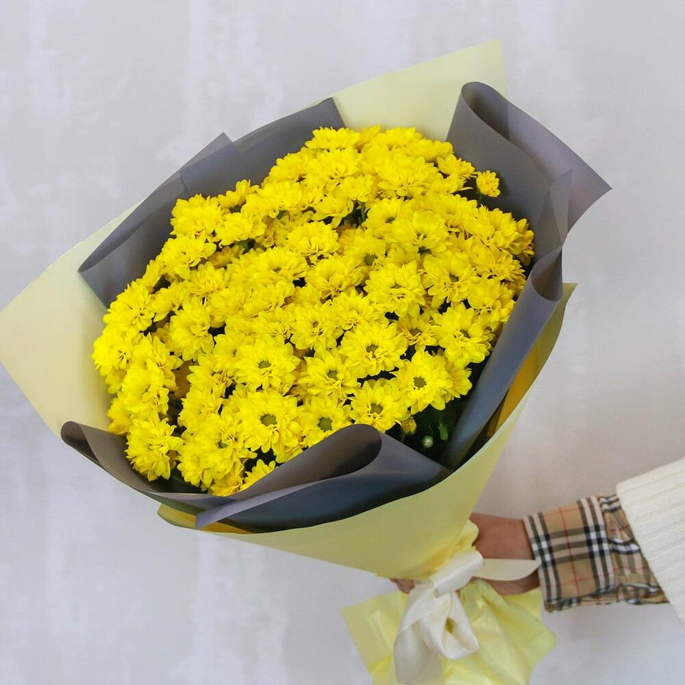 Букет из 25 желтых кустовых хризантем Сантини в стильной упаковке