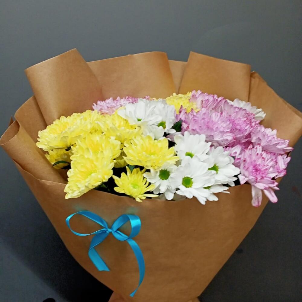 Хризантема кустовая – 9 шт.Лента атласная – 1 шт.Упаковка дизайнерская – 1 шт.