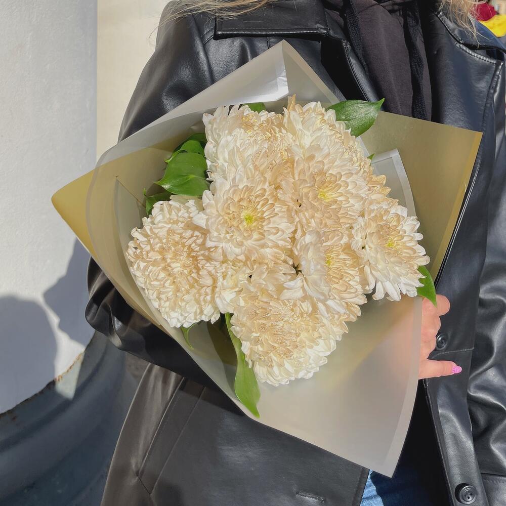 Хризантема кустовая – 3 шт.Рускус – 1 шт.бумага золото – 1 шт.бумага матовая – 1 шт.Лента – 1 шт.
