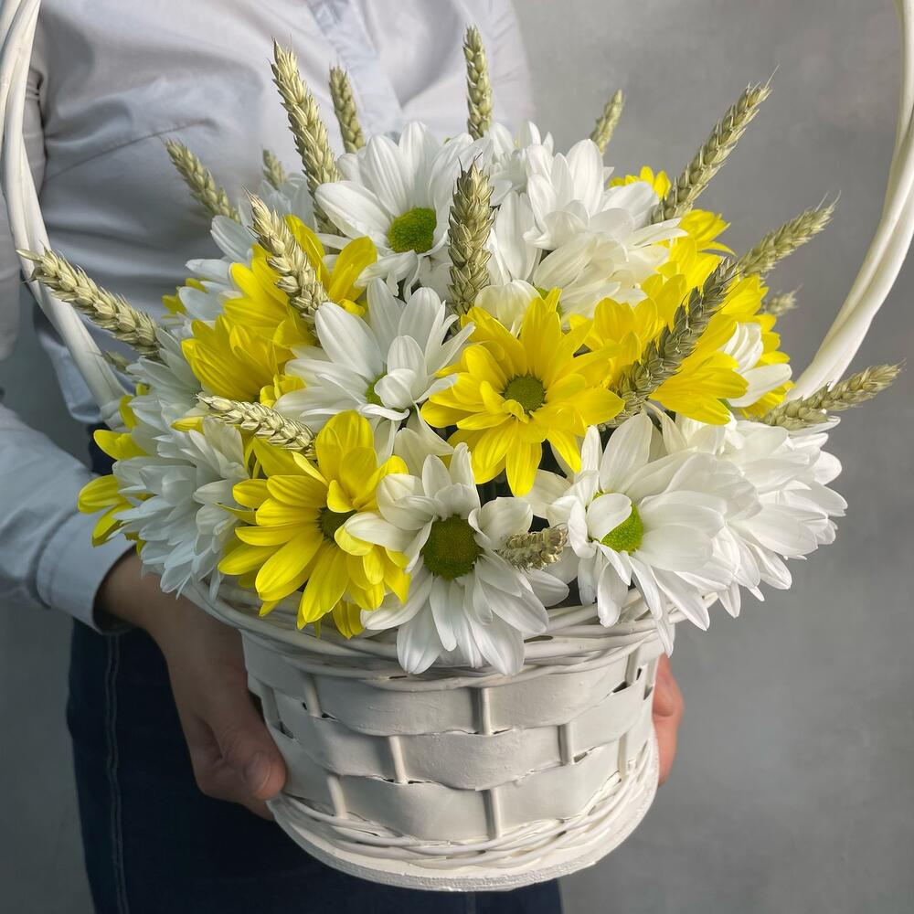 Корзина ротанговая – 1 шт.Оазис – 3 шт.Хризантема Кустовая Бакарди белая – 7 шт.хризантема кустовая селебрейт – 8 шт.Пшеница (сухоцвет) – 20 шт.