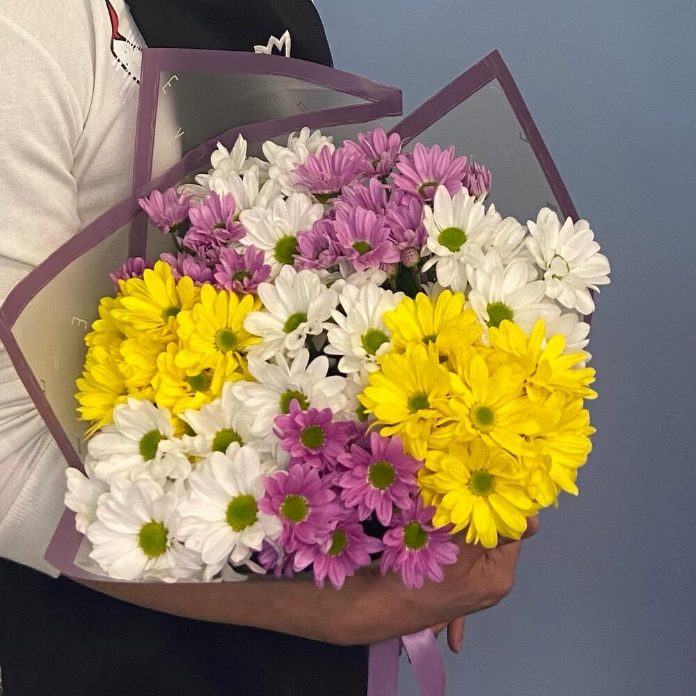 Кустовая хризантема – 9 шт.Упаковка дизайнерская – 1 шт.Лента атласная – 1 шт.