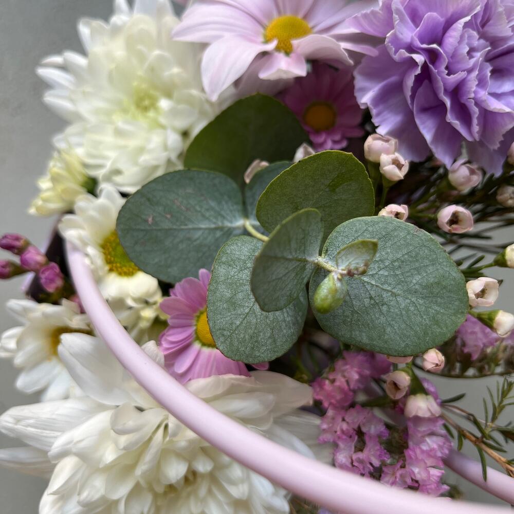 “Сиреневый туман” – композиция из гипсофилы в шляпной коробке