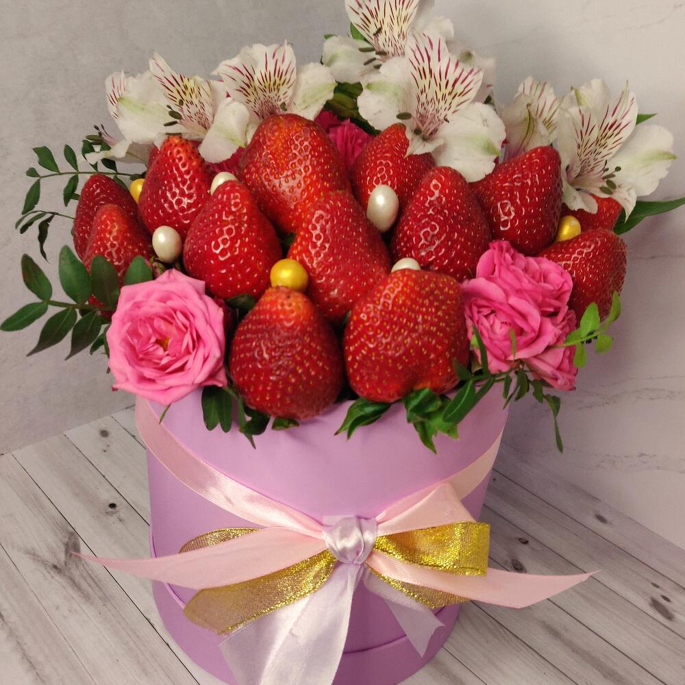 Альстромерия – 4 шт.Клубника – 800 гр.Кустовая роза – 5 шт.Шляпная коробка – 1 шт.Фисташка пучок – 3 шт.