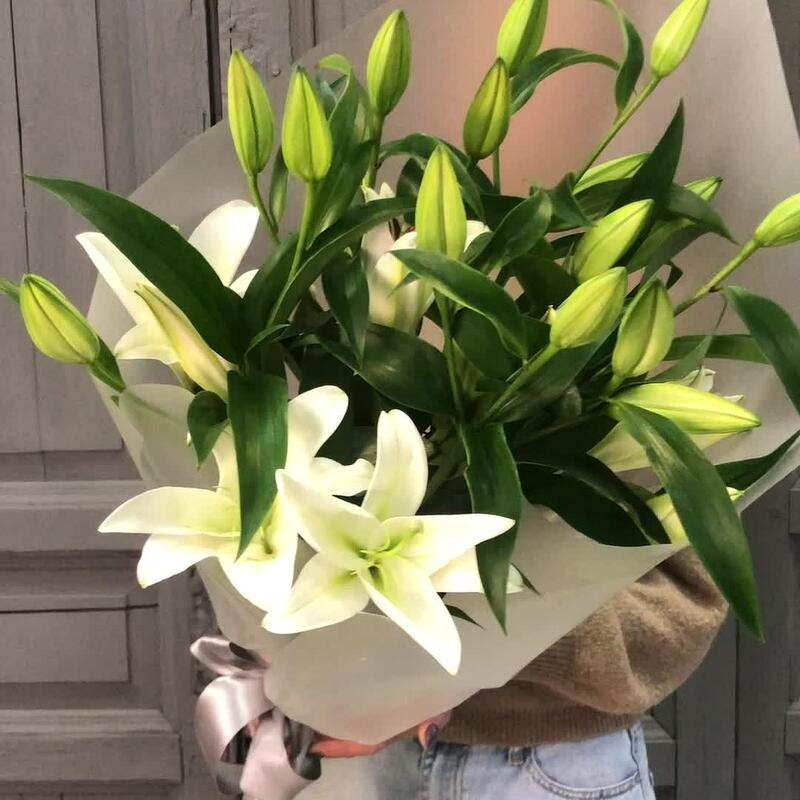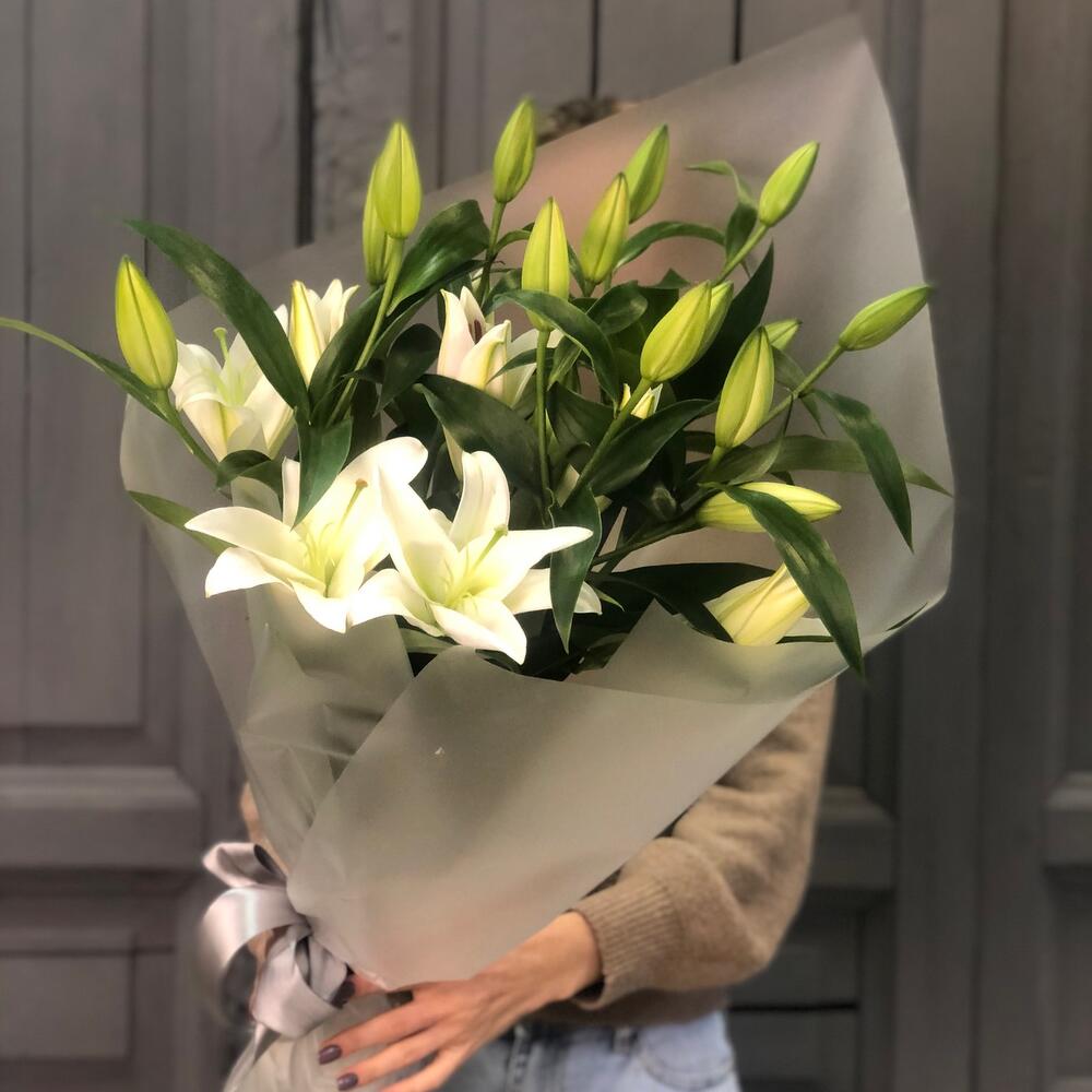 Лилия белая – 5 шт.Упаковка дизайнерская – 2 шт.Лента атласная – 2 шт.