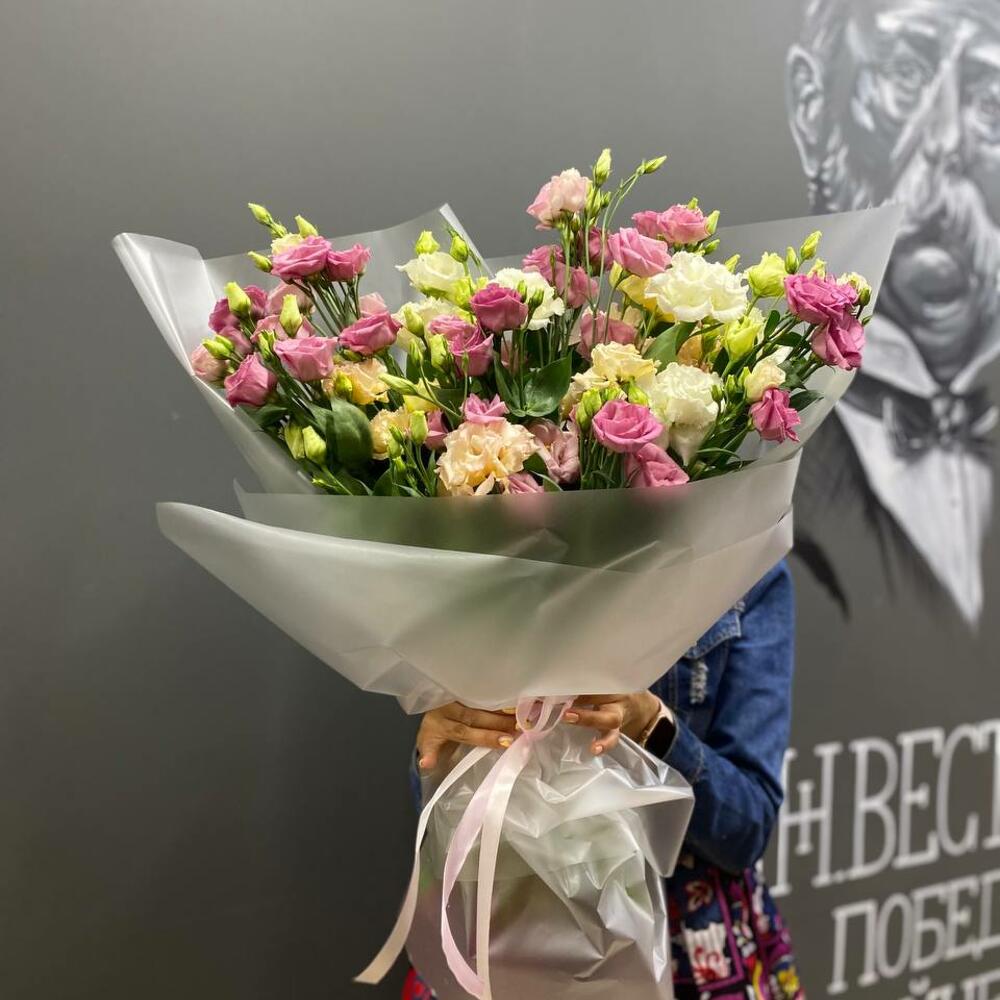 Букет из 15 белых и розовых эустом (лизиантусов) в стильной упаковке “Эландиэль”