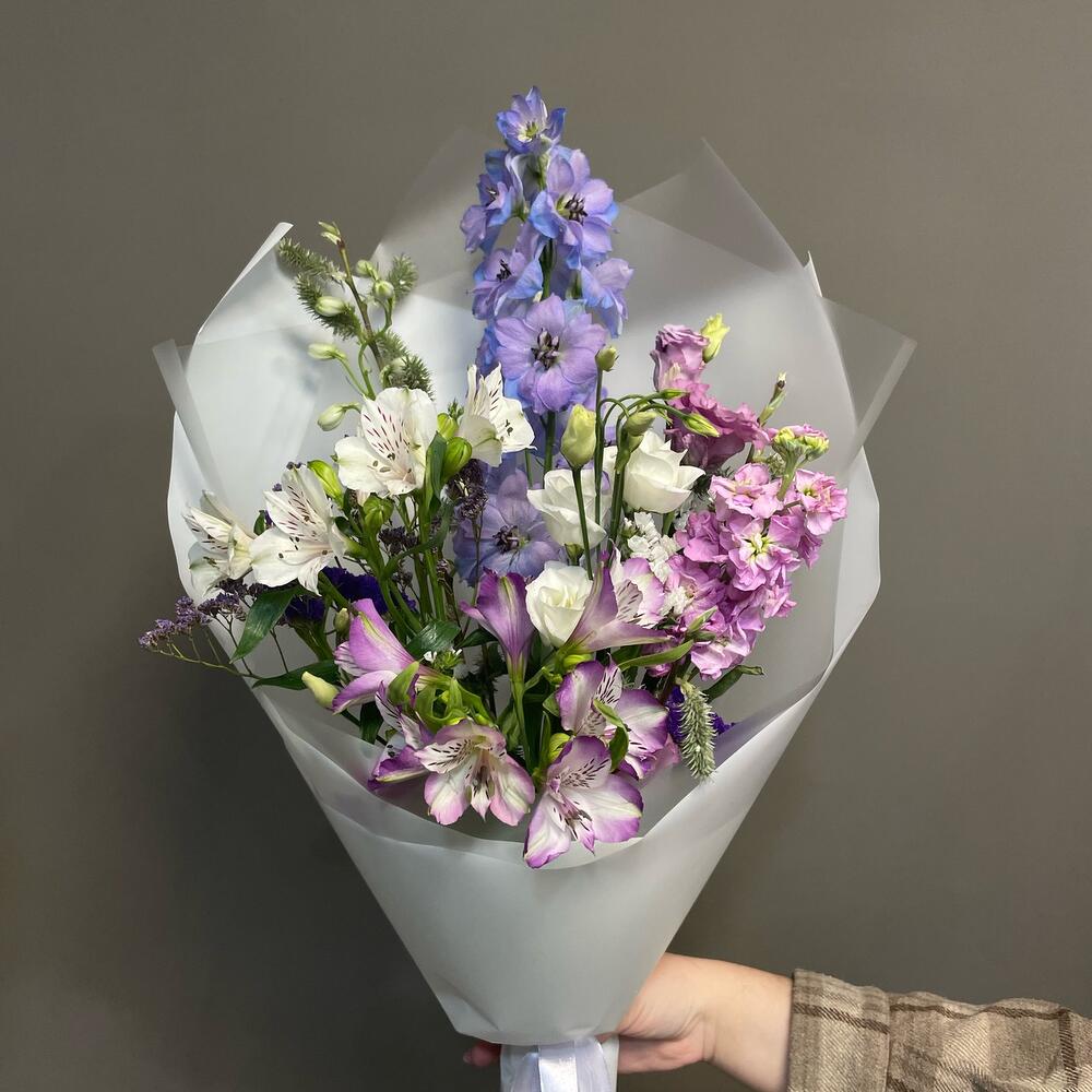 Весенний, нежный, звонкий букет. Воздушный и яркий. Красивые сиреневые тона очень романтично напоминают закатное небо.Большой синий дельфиниум создает акцент.
