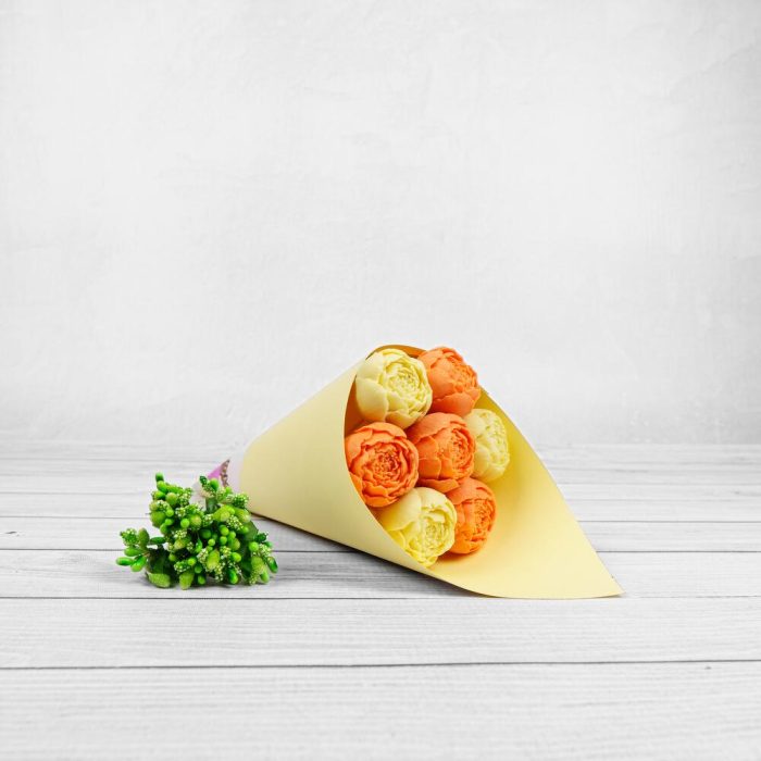Упаковка Кулек – 1 шт.Прозрачная пленка – 1 шт.шоколадные пионы из бельгийского шоколада – 7 шт.
