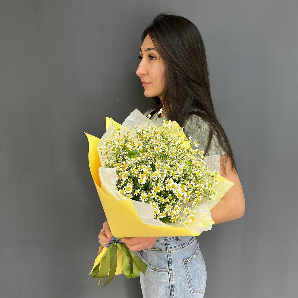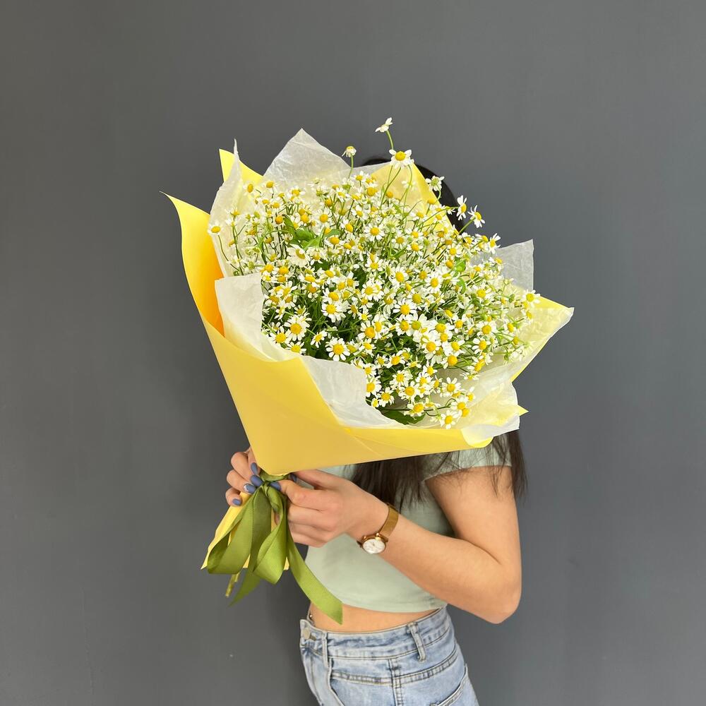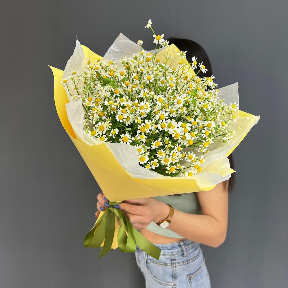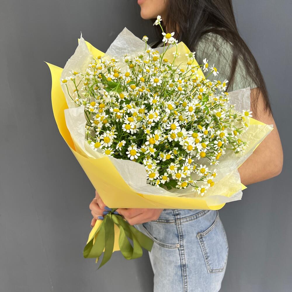 Атласная лента – 1 шт.Матрикария (Ромашка Камила) – 15 шт.Дизайнерская упаковка – 1 шт.