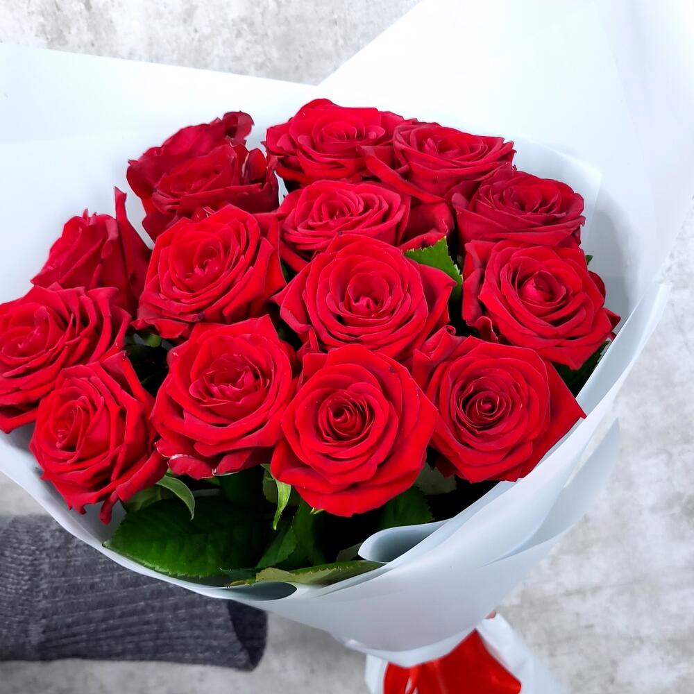 Лента – 1 шт.Упаковка – 1 шт.Роза красная 60 см – 15 шт.
