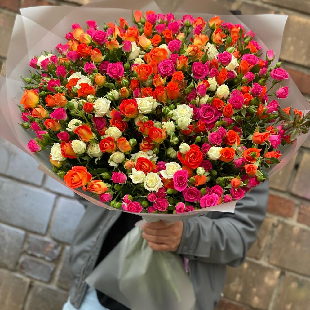 Кустовая роза – 51 шт.Лента атласная – 1 шт.Дизайнерская упаковка – 5 шт.
