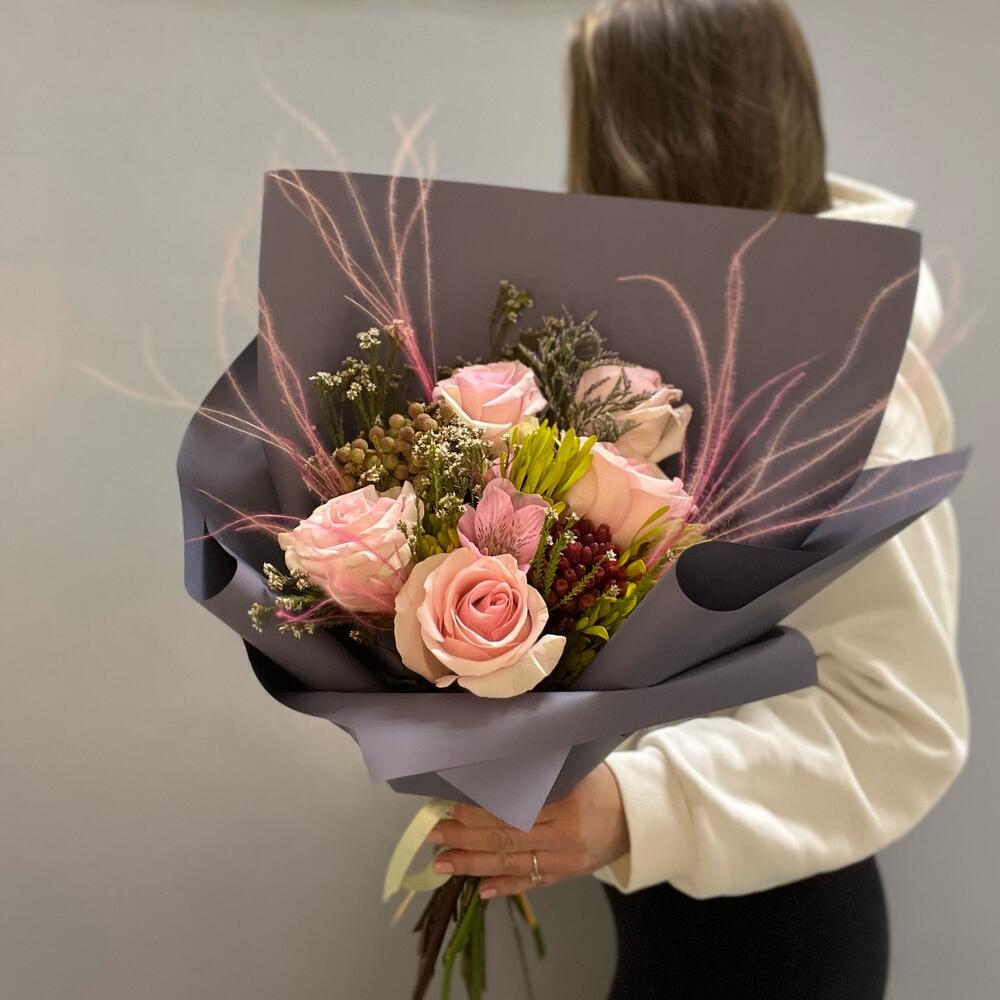 Роза Эквадор – 5 шт.Альстромерия – 1 шт.Ковыль – 2 шт.протейный микс – 1 шт.Упаковка дизайнерская – 1 шт.Лента атласная – 1 шт.