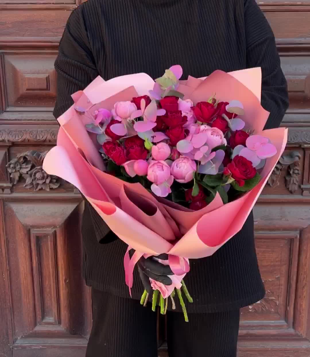 Лента атласная – 2 шт.Пленка матовая – 7 шт.Эвкалипт крашеный – 3 шт.роза кустовая пионовидная сильва пинк – 4 шт.роза кустовая ред трендсеттер – 5 шт.