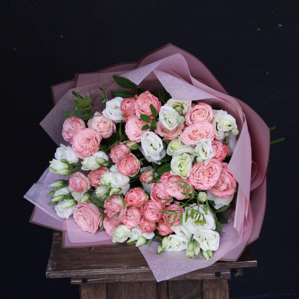 Эустома – 7 шт.Роза кустовая пионовидная мадам бомбастик – 10 шт.Фисташка – 2 шт.Тишью – 2 шт.Пленка дизайнерская – 2 шт.Лента атласная – 2 шт.