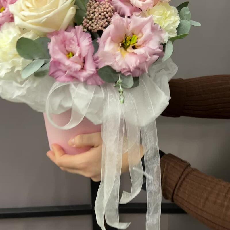 роза пионовидная вайт o’hara – 3 шт.эустома махровая розовая – 2 шт.Диантус – 4 шт.Ковыль – 1 шт.Озотамнус – 1 шт.Эвкалипт – 1 шт.Коробка шляпная – 1 шт.Оазис флористический – 1 шт.Тишью – 1 шт.Лента атласная – 2 шт.