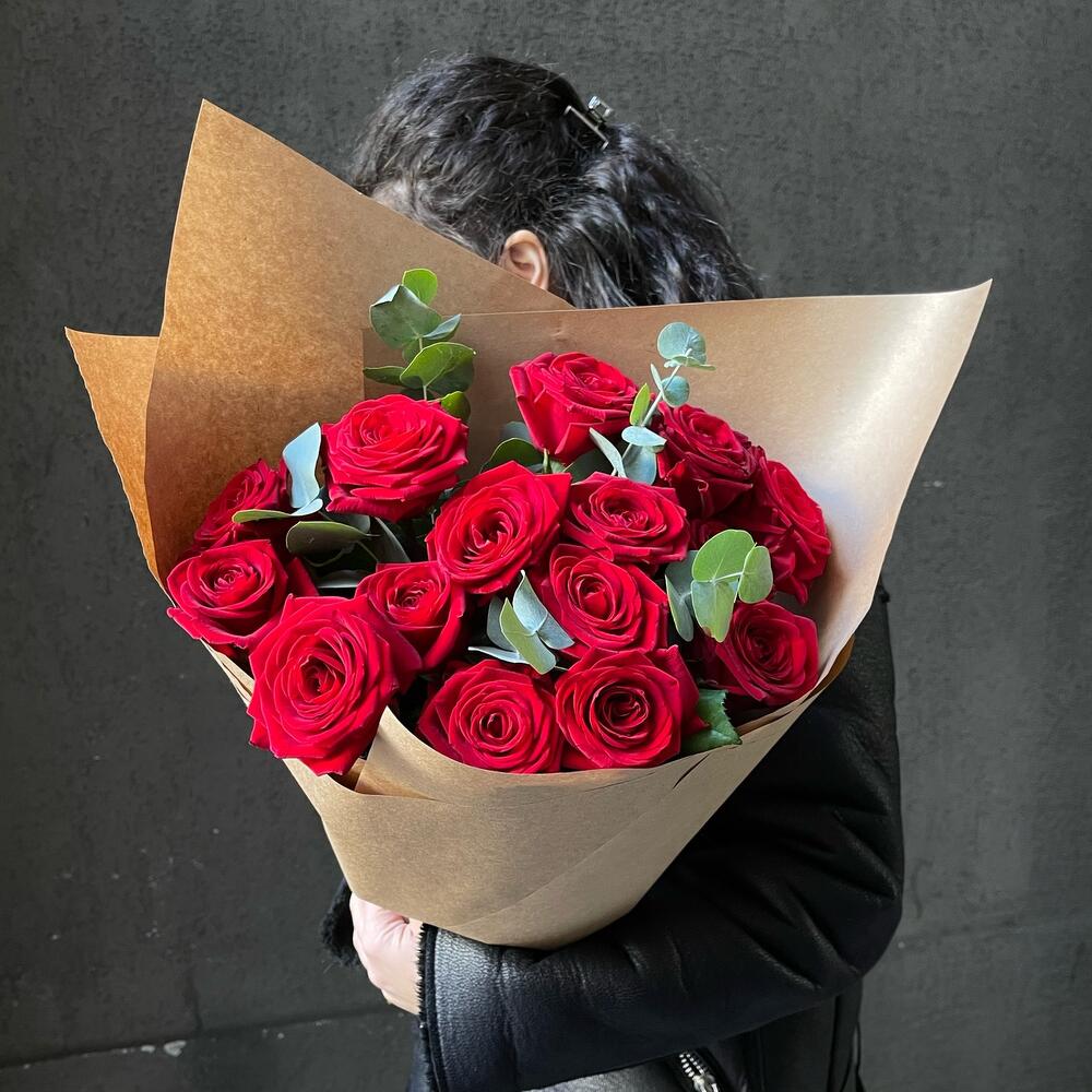 Букет 18: 15 красных роз с эвкалиптом