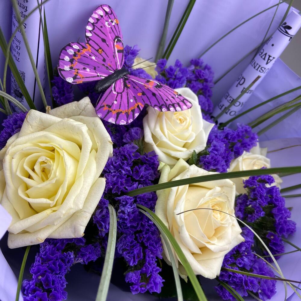 Роза одноголовая – 5 шт.Статица – 5 шт.зелень пучок – 1 шт.Декор бабочка – 1 шт.Упаковка дизайнерская – 1 шт.