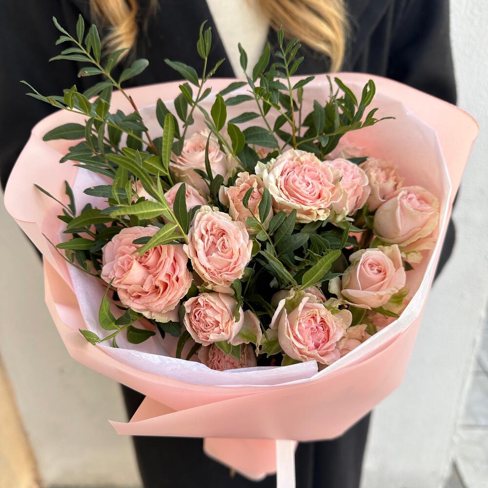 кустовая роза бомбастик 40 см – 5 шт. Писташ – 3 шт. Упаковка дизайнерская – 1 шт.