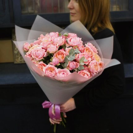 Эвкалипт – 2 шт.Крафт – 1 шт.Атласная лента – 9 шт.Кустовая пионовидная роза – 2 шт.Пленка матовая – 2 шт.