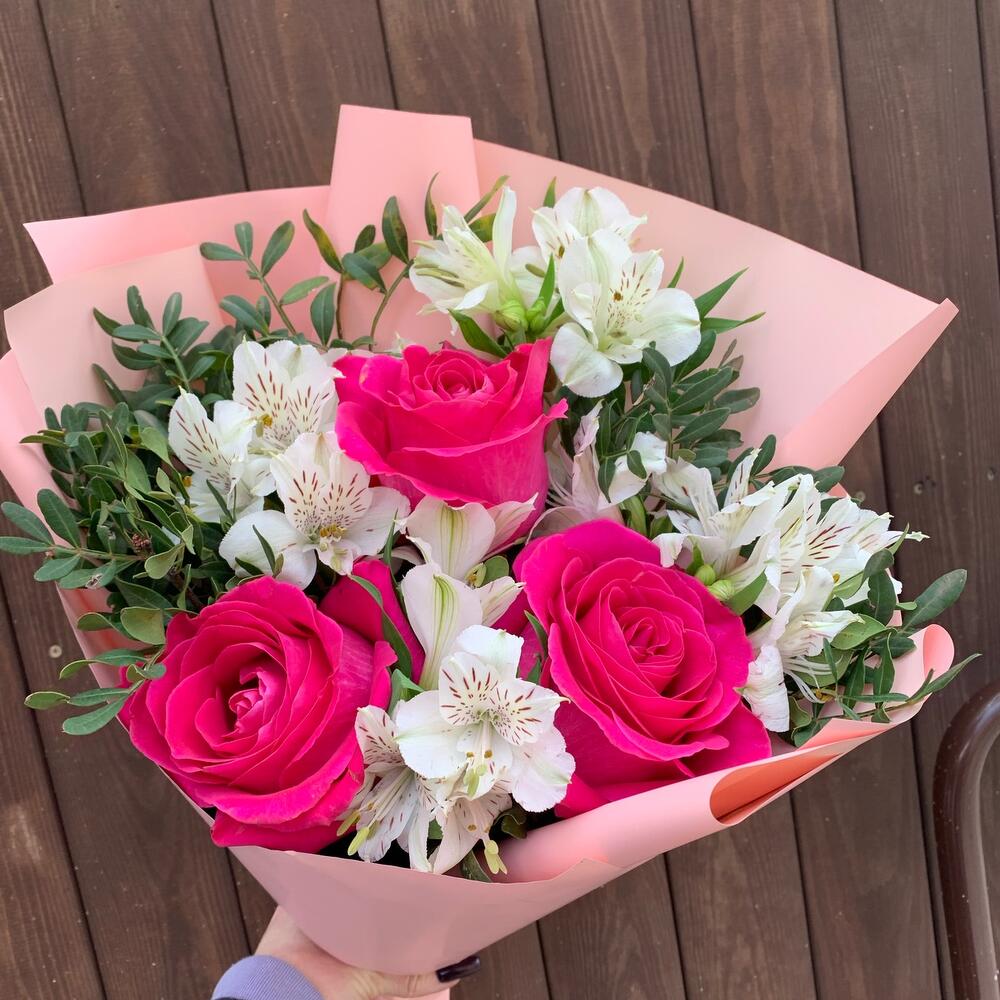 Роза Эквадор – 3 шт.Альстромерия – 5 шт.зелень декоративная – 3 шт.Упаковка дизайнерская – 2 шт.