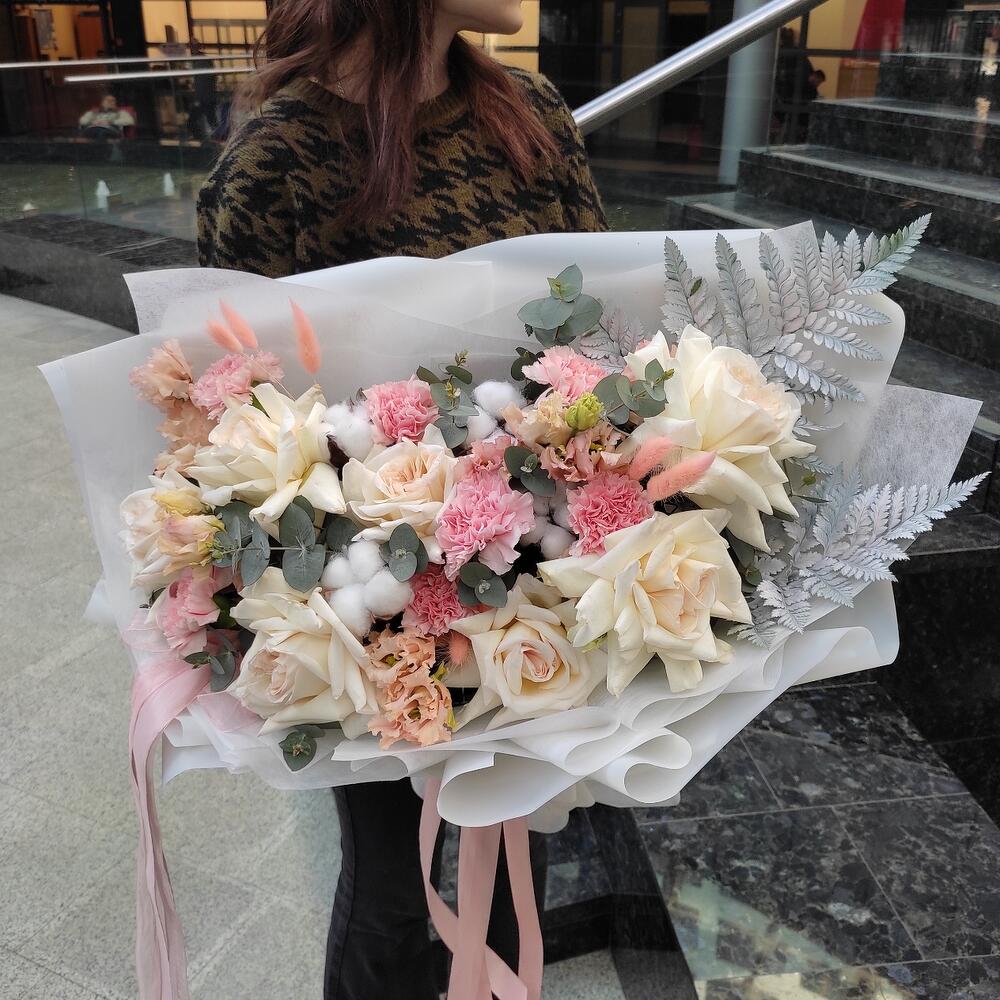 Роза пионовидная – 7 шт.Гвоздика – 7 шт.Хлопок – 5 шт.Лизиантус – 3 шт.Папоротник – 2 шт.Эвкалипт – 2 шт.Лагурус – 7 шт.Упаковка дизайнерская – 2 шт.Лента атласная – 2 шт.