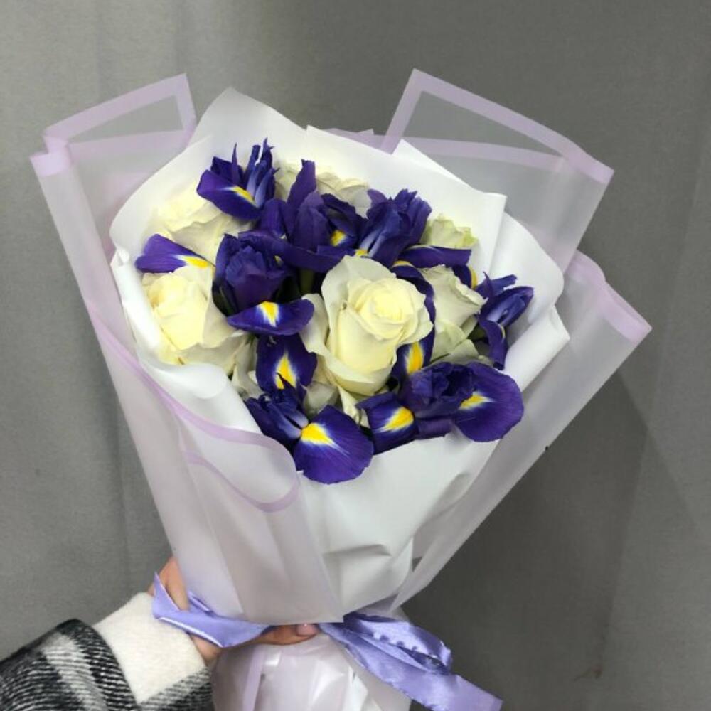 Роза белая 40 см – 6 шт.Ирис синий – 5 шт.корейская бумага – 2 шт.Атласная лента – 1 шт.