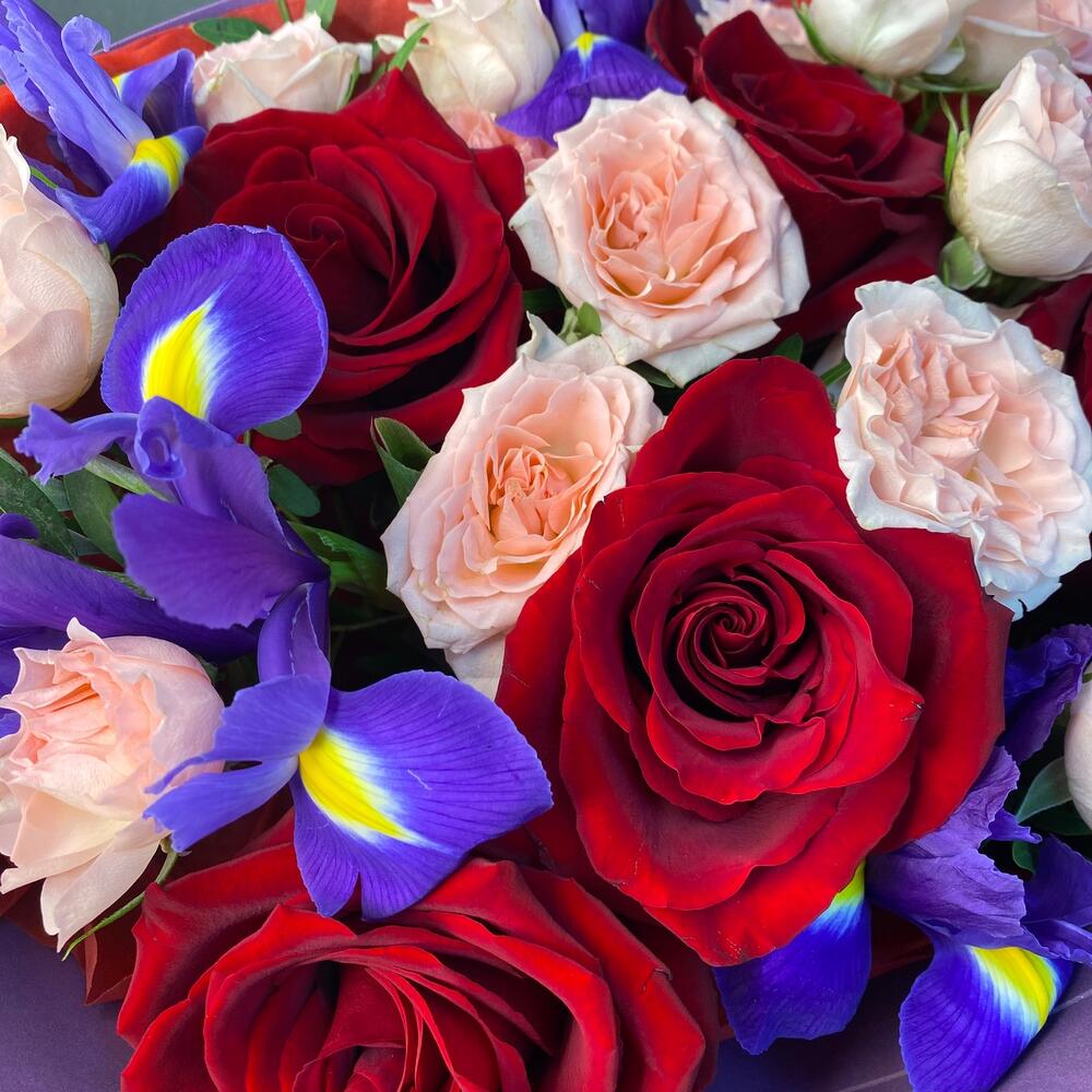 Роза красная Эквадор – 5 шт.ирис синий голландия – 5 шт.Роза кустовая – 3 шт.зелень декоративная – 2 шт.Упаковка дизайнерская – 2 шт.