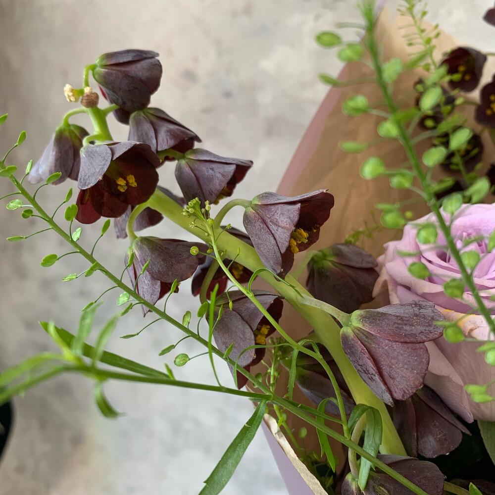 Роза оушен сонг – 5 шт.Фритиллярия – 3 шт.Таласпи – 1 шт.Маттиола – 2 шт.Упаковка дизайнерская – 1 шт.