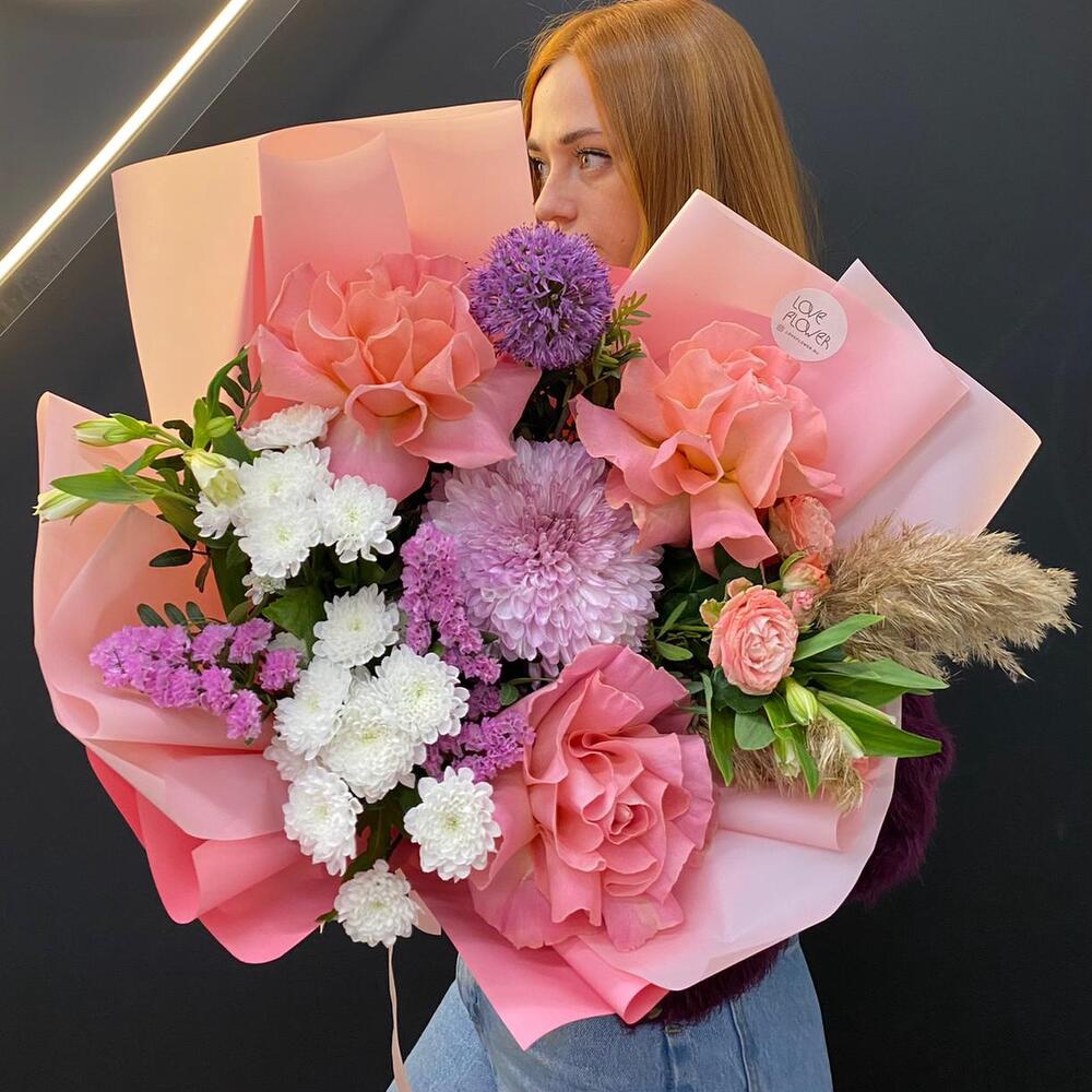 Роза Эквадор – 3 шт.Аллиум – 1 шт.Роза кустовая – 1 шт.Альстромерия – 2 шт.Хризантема одноголовая – 1 шт.