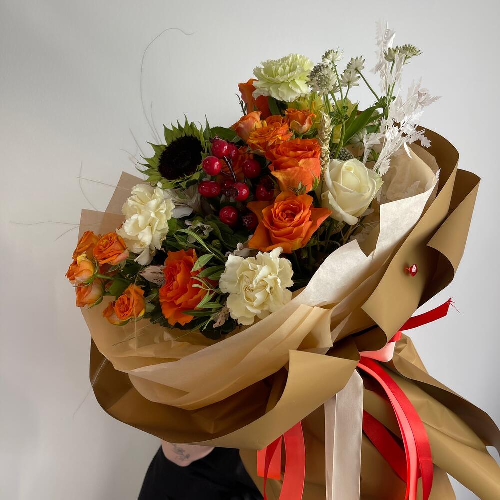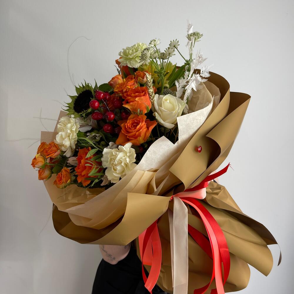 Подсолнух – 1 шт.Диантус – 3 шт.Альстромерия – 2 шт.Кустовая роза – 2 шт.Роза Россия – 5 шт.Астранция – 1 шт.Ягоды декоративные – 1 шт.Папоротник – 1 шт.Фисташка пучок – 1 шт.Пленка матовая – 6 шт.Лента атласная – 2 шт.