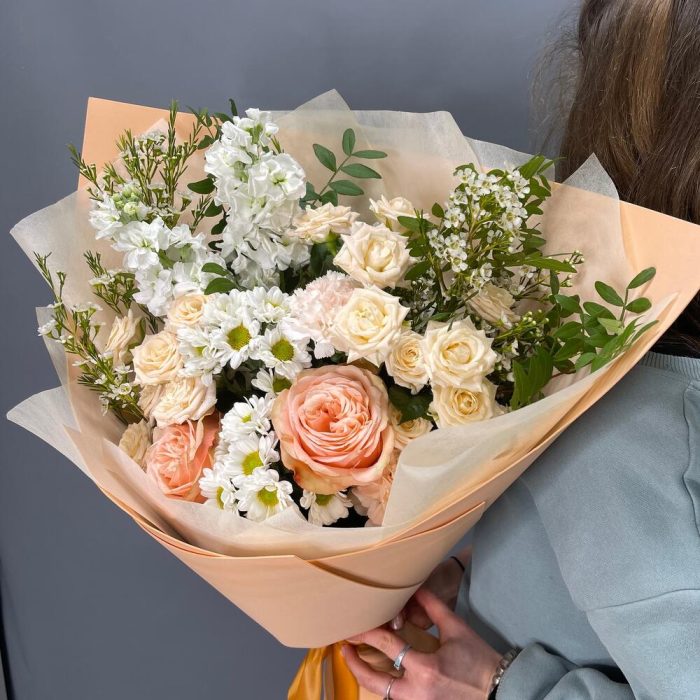 Маттиола – 2 шт.Гвоздика – 2 шт.Лента атласная – 1 шт.Сантини – 2 шт.Фисташка – 2 шт.Упаковка дизайнерская – 1 шт.Ваксфлауэр белый – 2 шт.кахала роза – 2 шт.таня кустовая роза – 4 шт.