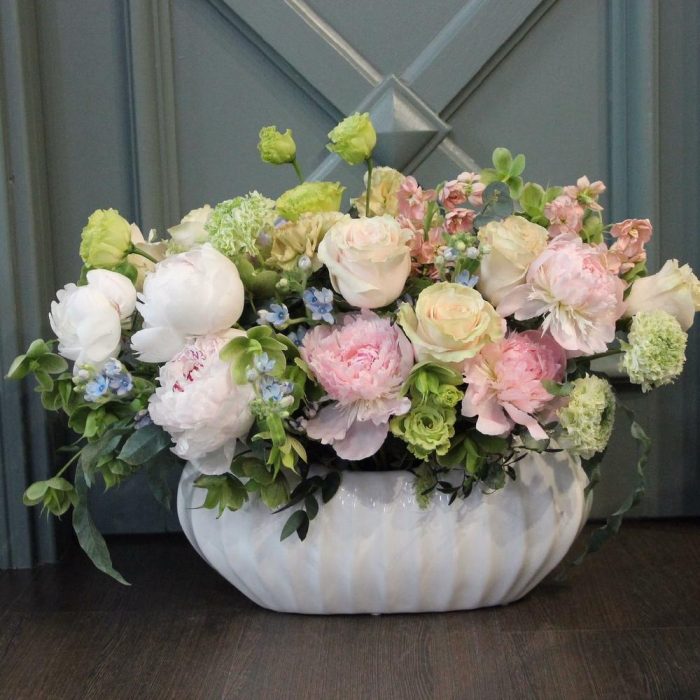 Пион – 9 шт.Твидия – 6 шт.Лизиантус – 3 шт.Маттиола – 3 шт.Роза – 7 шт.Эвкалипт – 4 шт.флебодиум – 3 шт.Ваза керамика – 1 шт.Оазис флористический – 1 шт.