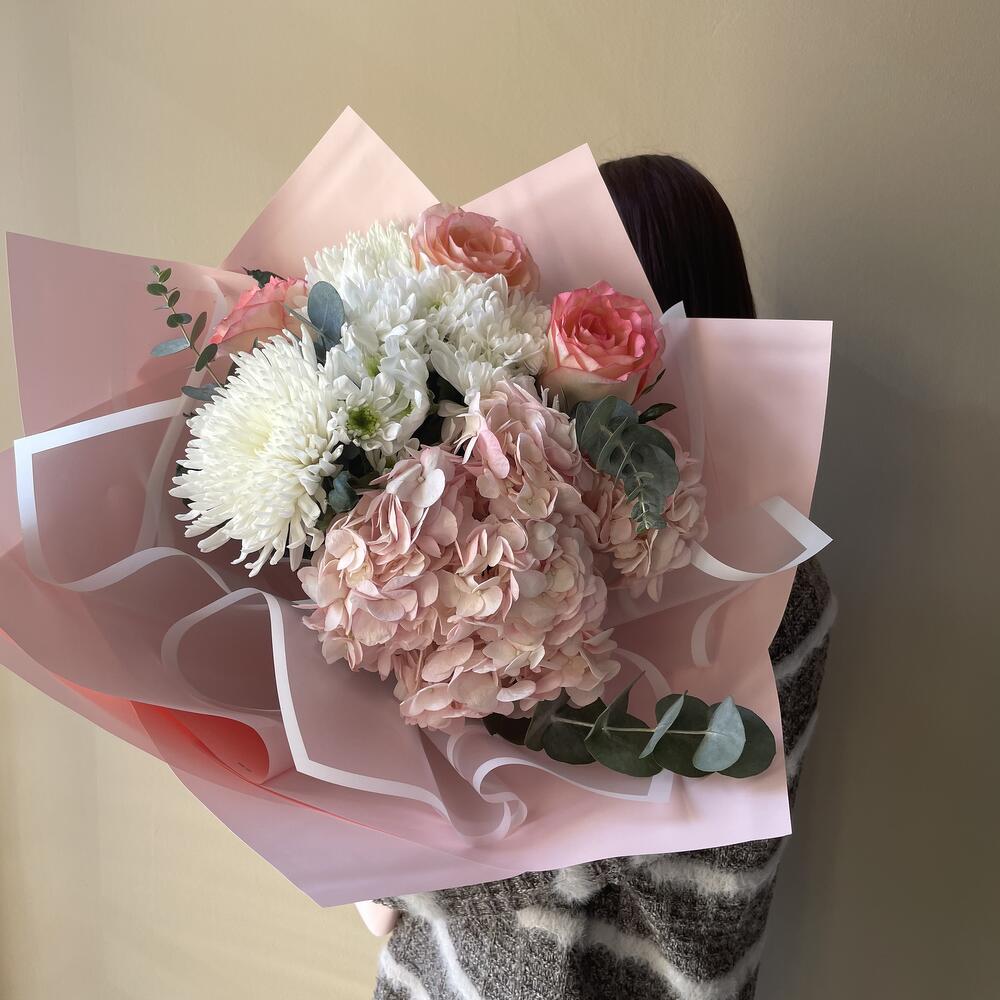 Альстромерии, Гвоздики, Кустовые розы, Лизиантусы, Розы, Хризантемы