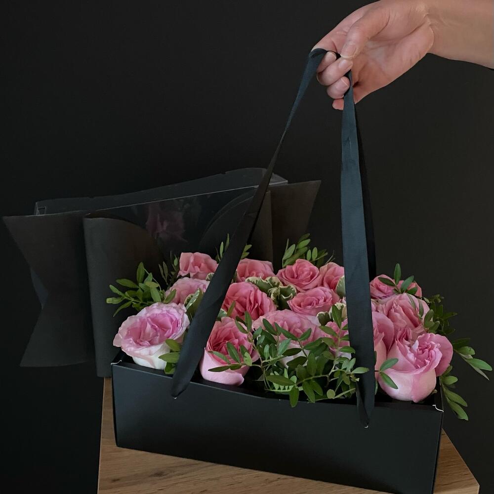 Необычная, шикарная коробка с бантом в черном цвете и шикарными розовыми розами. Создаст шарм и приятные впечатления для получателя.
